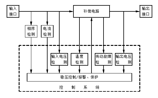 在穩(wěn)壓供電工況下,當(dāng)輸入的電壓出現(xiàn)波動(dòng)時(shí),裝置通過輸入輸出電量采樣系統(tǒng)獲取反饋電壓,再經(jīng)穩(wěn)壓控制器判斷、處理輸出電壓補(bǔ)償控制指令,控制調(diào)壓器碳刷架上升下降,調(diào)節(jié)補(bǔ)償變壓器主回路的正反電壓補(bǔ)償量,從而達(dá)到穩(wěn)壓輸出目的,即當(dāng)輸入電壓低時(shí),控制電壓正補(bǔ)償(補(bǔ)償電壓與輸入電壓相位相同疊加),當(dāng)輸入電壓高時(shí),控制電壓負(fù)補(bǔ)償(補(bǔ)償電壓與輸入電壓相位相反相減)。岸電穩(wěn)壓裝置基本原理框圖如下: